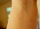 Although the tattoos are sometimes considered invisible in normal light, scarring from the tattoo machine in the application process may remain, and therefore still show. A UV tattoo becomes visible under blacklight, when it glows in colors ranging from white to purple, depending on the ink chosen. Colored ink is also available, where the ink is visible in normal light (as with a regular tattoo) but the ink will glow vividly under UV light. However, some UV inks are not as bright under normal light as normal tattoo ink and are considered not as vibrant.